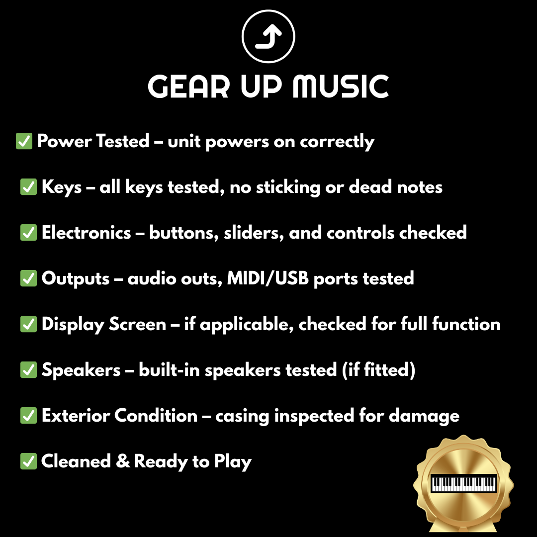 Good condition, plays great. The odd mark here and there as expected for a used instrument. Includes power supply.