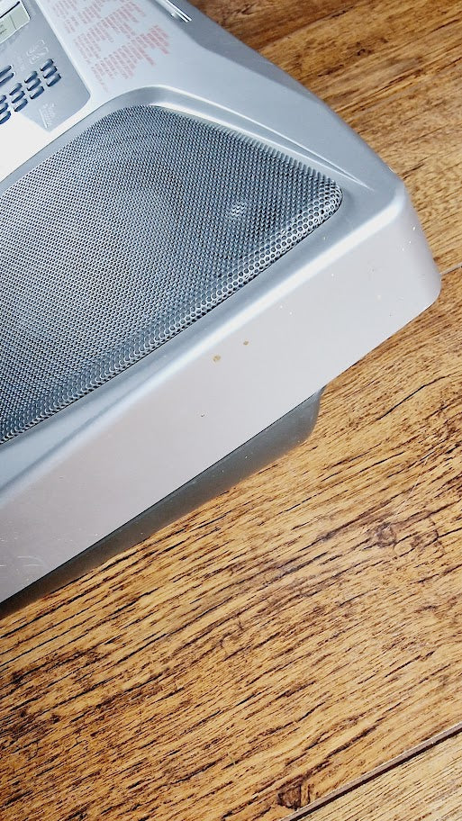 Plays great, cosmetically ok condition. Inludes power supply. Has various marks / scuffs across the keyboard. No battery cover and missing battery spring - looks like a previous battery leak. Not needed as has power supply. Small piece of plastic missing from past. Cosmetically, this is OK but the perfect starter instrument for cheap!