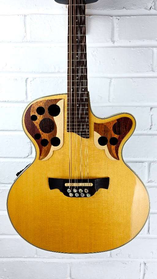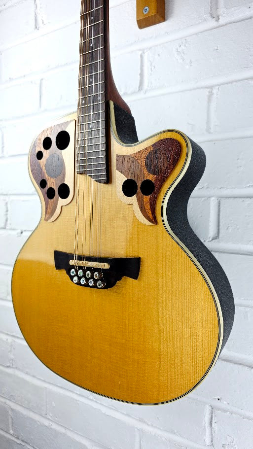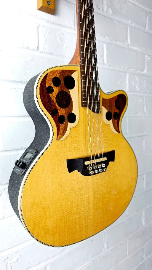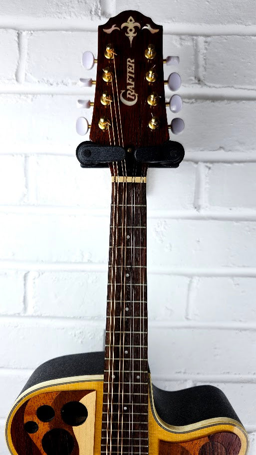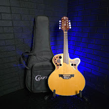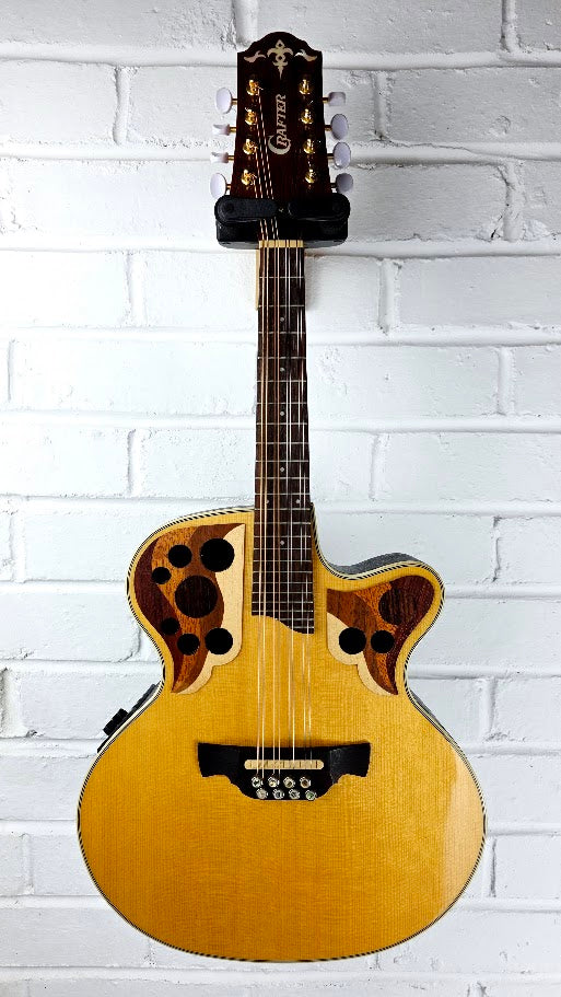 This Crafter M85E natural electro-acoustic mandolin delivers a winning combination of attractive looks, solid build, and stage readiness. Its distinctive multi-soundhole design adds flair and enhances projection, while the ashwood top and mahogany neck bring a clear, resonant voice. Equipped with a CR-T2V preamp featuring piezo pickup and onboard tuner, it’s perfect for live gigs or studio work. Comfortable to hold thanks to its single-cutaway hollow-body design, the M85E is a joy to play, whether plugged in or acoustic.