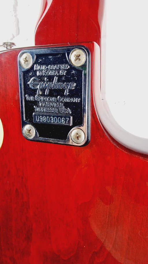 Overview: Step back into the golden age of guitar craftsmanship with the Epiphone Les Paul 100 Cherry Sunburst. Made in Korea in March 1998 at the renowned Unsung factory, this left-handed electric guitar offers a blend of vintage appeal, exceptional playability, and the classic Les Paul tone that has shaped rock music for decades.