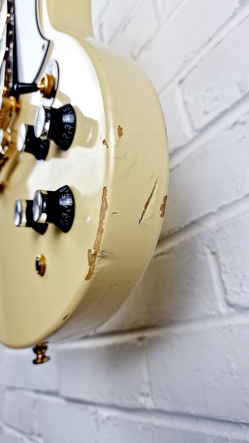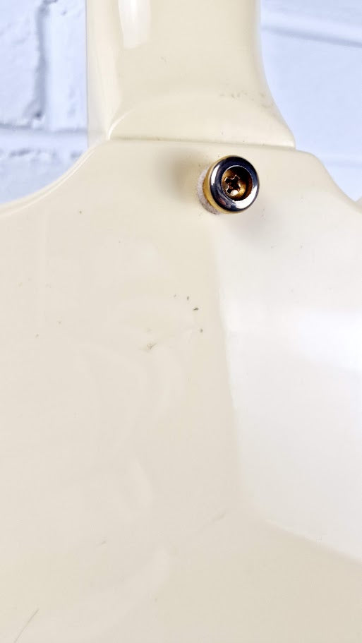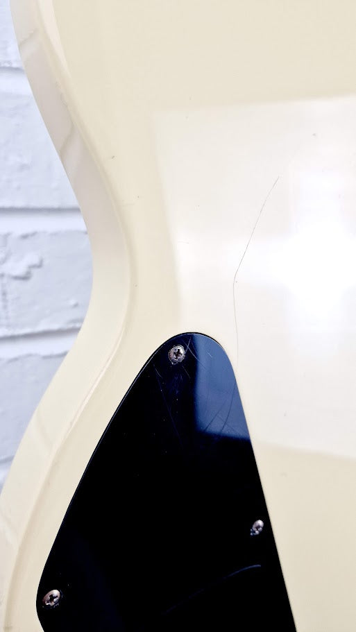 Plays great. Cosmetically, please see photos. Various marks/dinks/lacquer peel/cracks to lacquer, evidence of gigging. This is not meant to be sat in a museum, this is meant to be played! Awesome sounds from the triple pick ups.