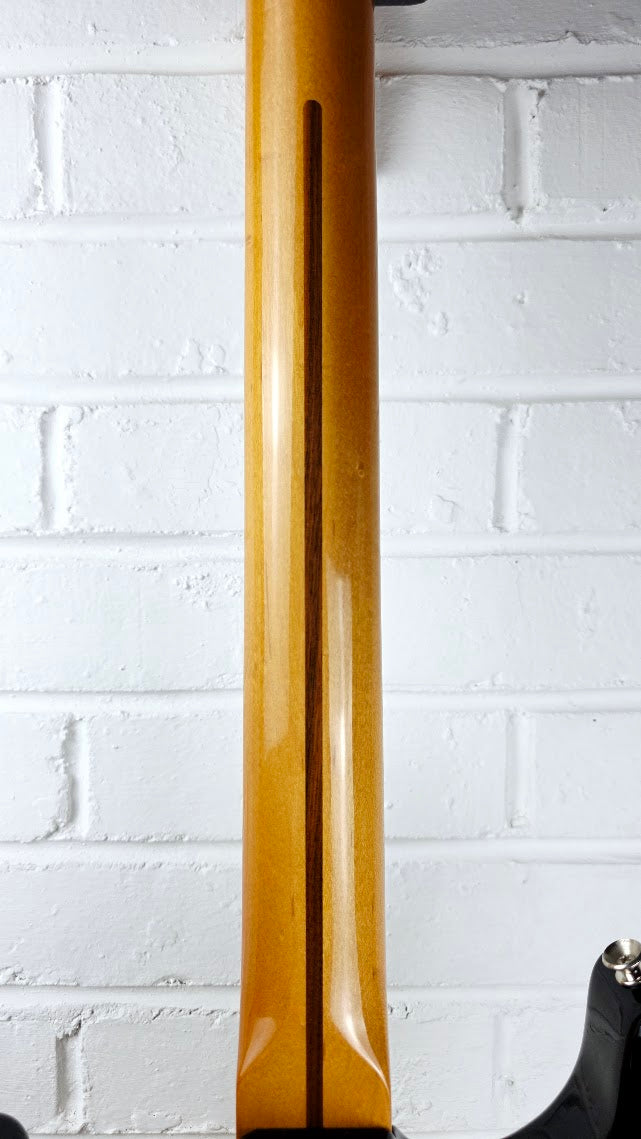 The Fender Classic Series 50s Stratocaster captures the timeless style and tone of Fender’s golden era. Made in Mexico in 2004, this model offers vintage-inspired features such as a soft "V" maple neck, single-coil pickups with crystal-clear articulation, and a classic synchronised tremolo. Its black finish paired with a single-ply pickguard gives it a sleek, understated look that’s pure Strat. Whether you’re into blues, surf, rock ’n’ roll or pop, this guitar delivers that unmistakable Fender sparkle and chime.