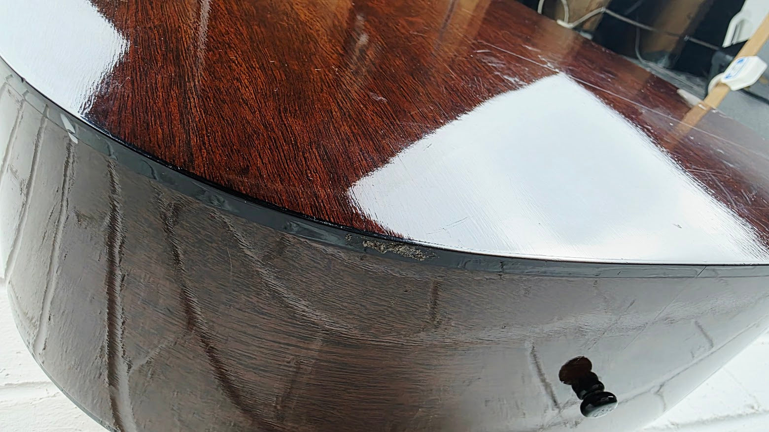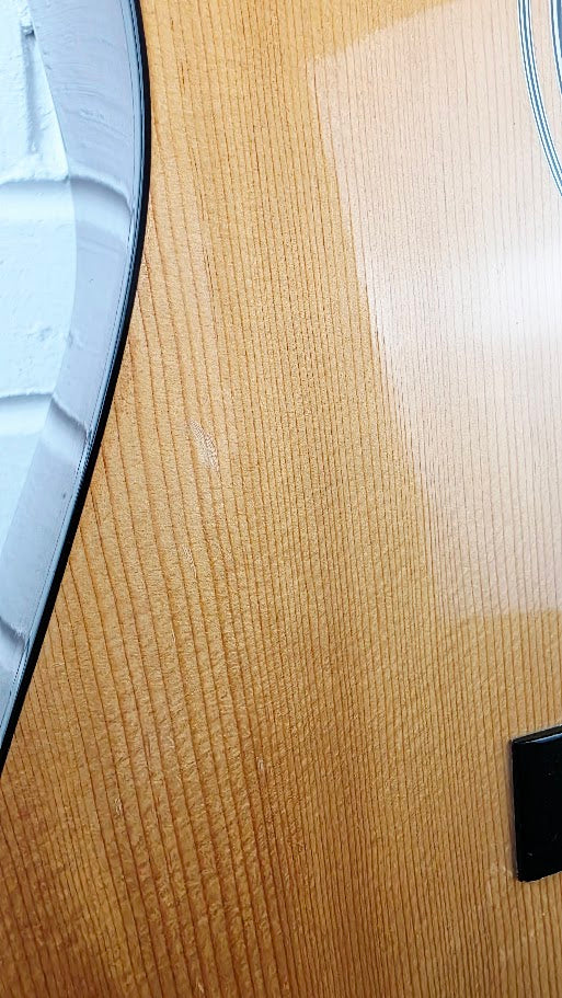 Good condition, plays great. The odd mark here and there as expected for a used instrument. There are some cosmetic dings and surface wear, particularly on the top and edges, but structurally it's solid and performance-ready. Great starter guitar.