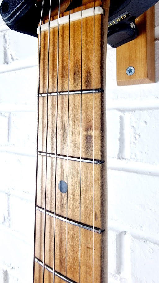 Good condition, plays really well. Rare early 90s japanese squier. Guitar has been well loved but still has plenty of life. Has various marks and dinks to the body, both front and back. Tarnishing to metal work, and some light fretwear. Base of guitar has some lacquer peel, and small aged related cracks to lacquer at base of neck. All purely cosmetic.